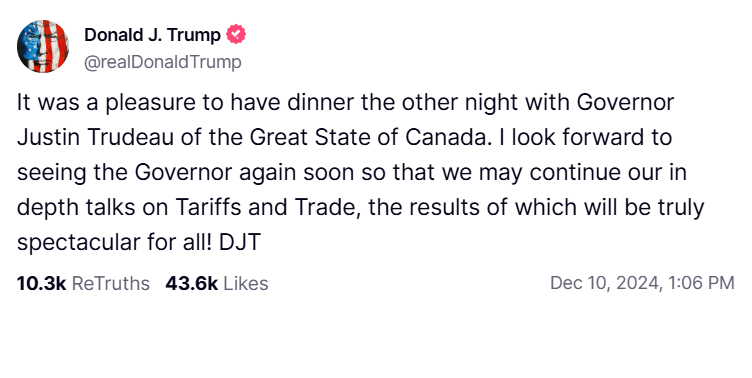 特朗普計劃上任後對加拿大貨品徵收25%關稅。杜魯多上月底突然到訪佛羅里達州海湖莊園,與特朗普會晤並共晉晚餐。據報特朗普向杜魯多指出,若加拿大承受不起新關稅,應被納入美國版圖。