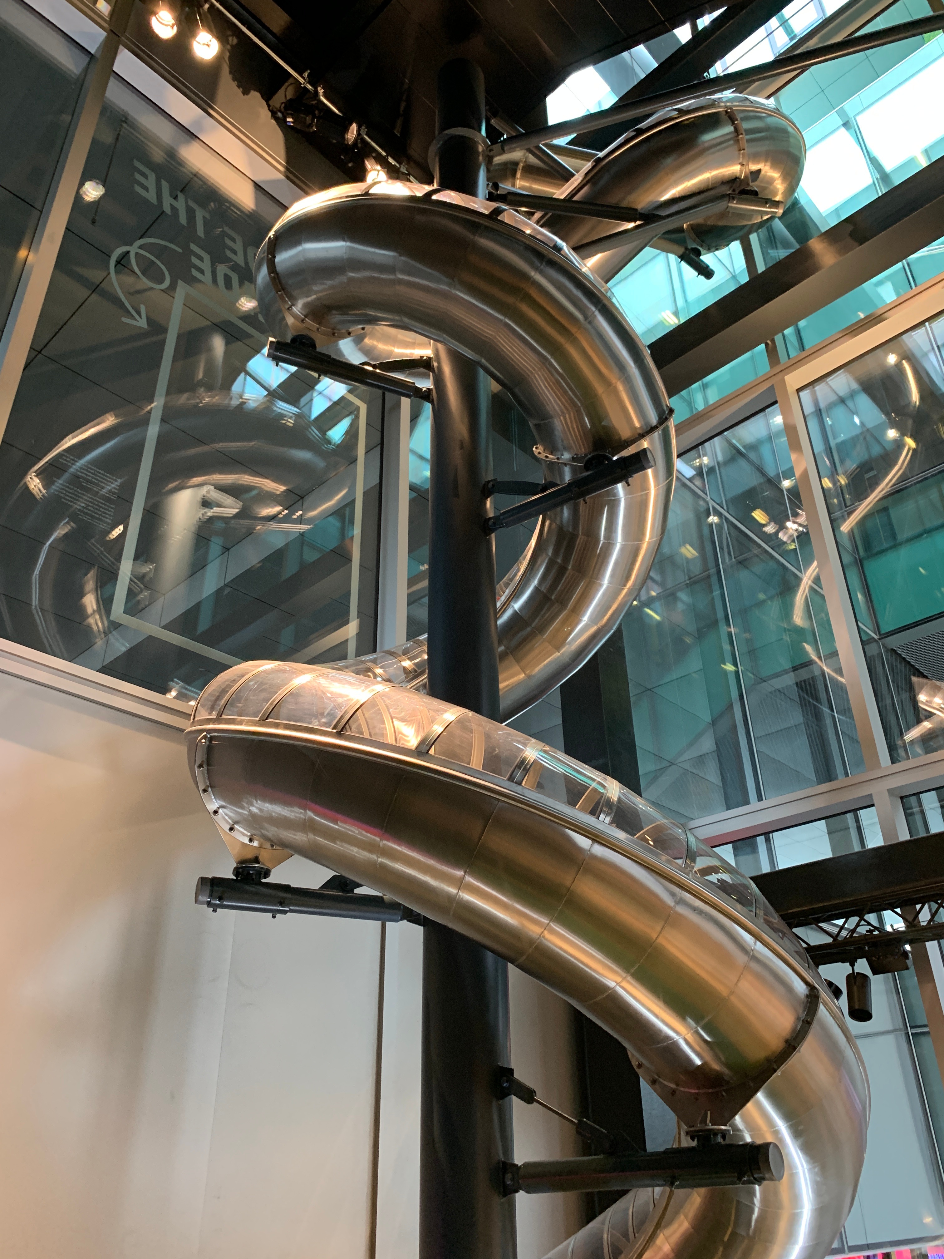 另外的裝置就是我們經過外面看到,吸引我們進場的四層樓高的旋轉滑梯。入口位於DAC的四樓展覽廳,將下半身塞入一個大布袋坐好,輕微往後躺下便能夠從四樓一下子滑到地下,過程大約十二秒。地面的滑梯出口旁是條長樓梯可以上去再玩,因為入場後可以無限次滑這條滑梯,我們每人也滑了很多次才捨得離開呢!