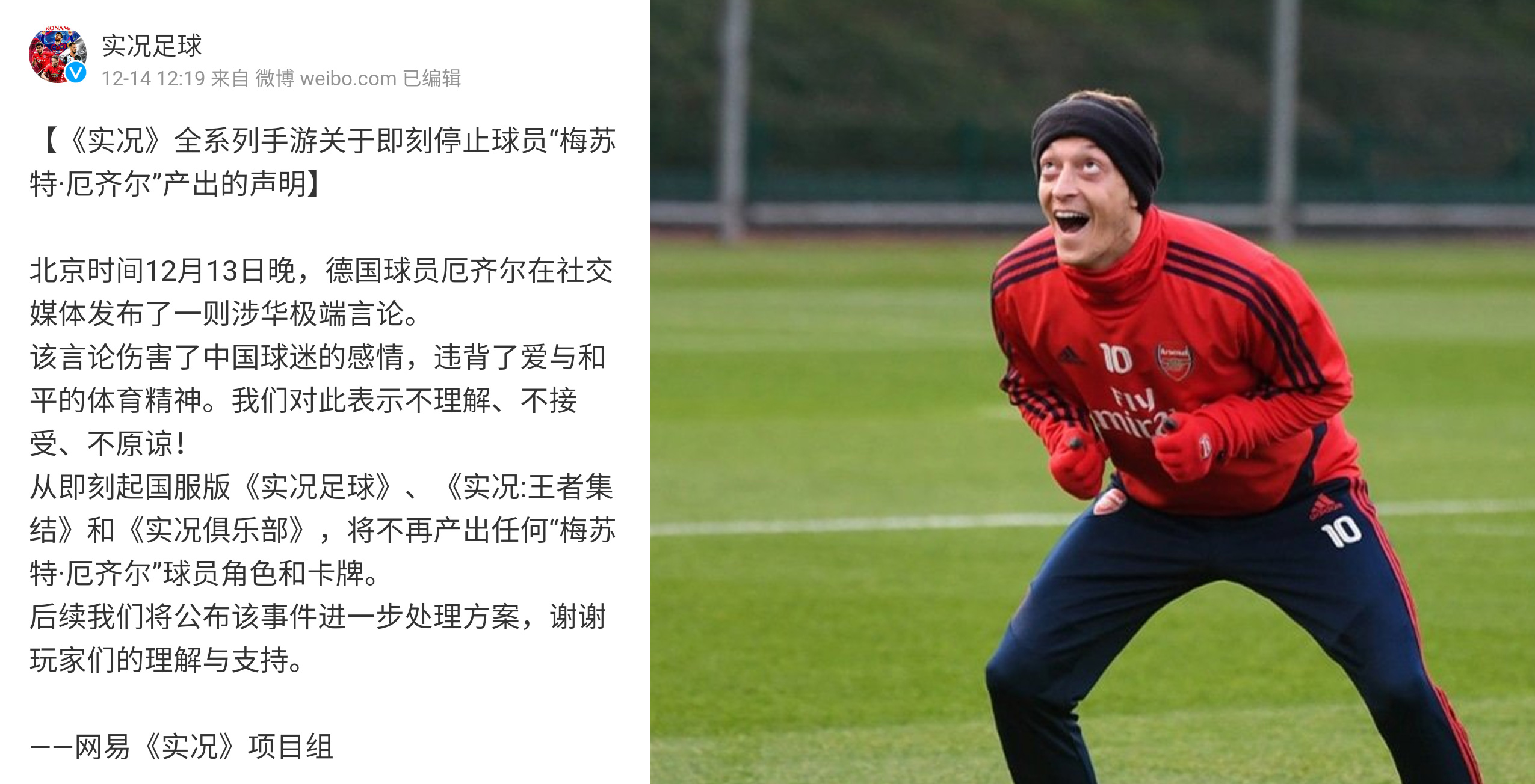 今日(12月16日)有消息指,由日本遊戲公司Konami開發、網易遊戲代理的中國版足球遊戲《PES 2020》,删除有關奧斯爾的一切資料。「實況足球」的微博發出「《實況》全系列手游關於即刻停止球員“梅蘇特·厄齊爾”(奧斯爾)產出的聲明」,聲明指奧斯爾言論傷害了中國球迷的感情,違背了愛與和平的體育精神。對此表示不理解、不接受、不原諒!從即刻起國服版《實況足球》、《實況:王者集結》和《實況俱樂部》,將不再產出任何奧斯爾球員角色和卡牌。