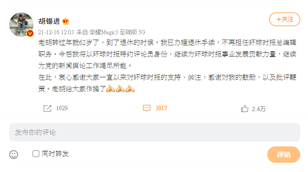 《環球時報》總編輯胡錫進今日(12月16日)中午於微博發文,指已辦理退休手續,不再擔任總編輯職務。