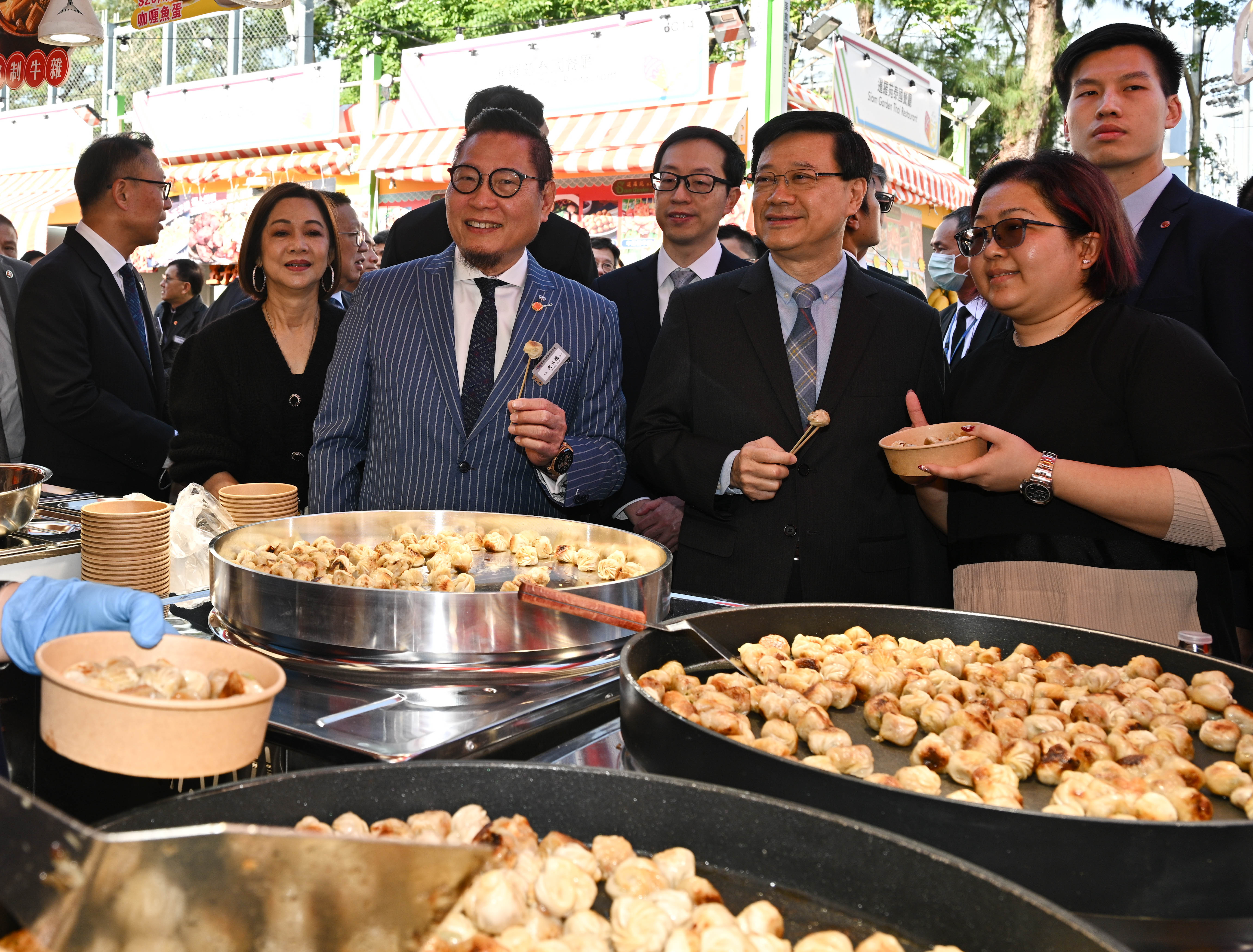 李家超表示,在場品嚐了不同的東西,包括生煎包、魚蛋,又買了合桃,又支持了一個地中海貧血的基金,買了一個手袋我太太,又買了金蠔給媽媽做冬。買手袋大約200元,金蠔大約900元,另外合桃大約是200至400元。
