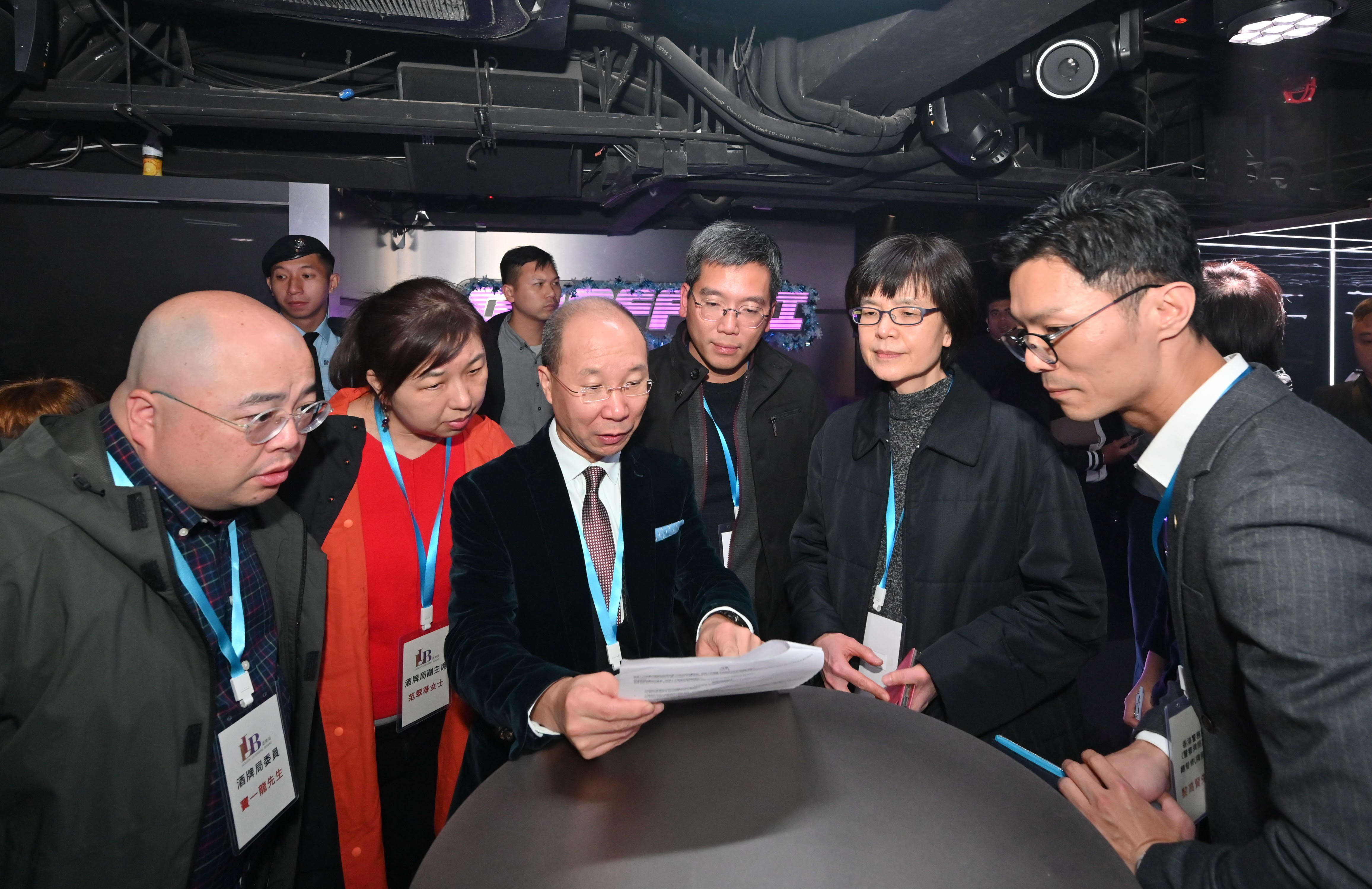 酒牌局成員今日(12月17日)凌晨在主席黃江天率領下,前往中區和尖沙咀區多間領有酒牌的處所,實地了解有關處所的經營情況及警務處和消防處的執法行動。