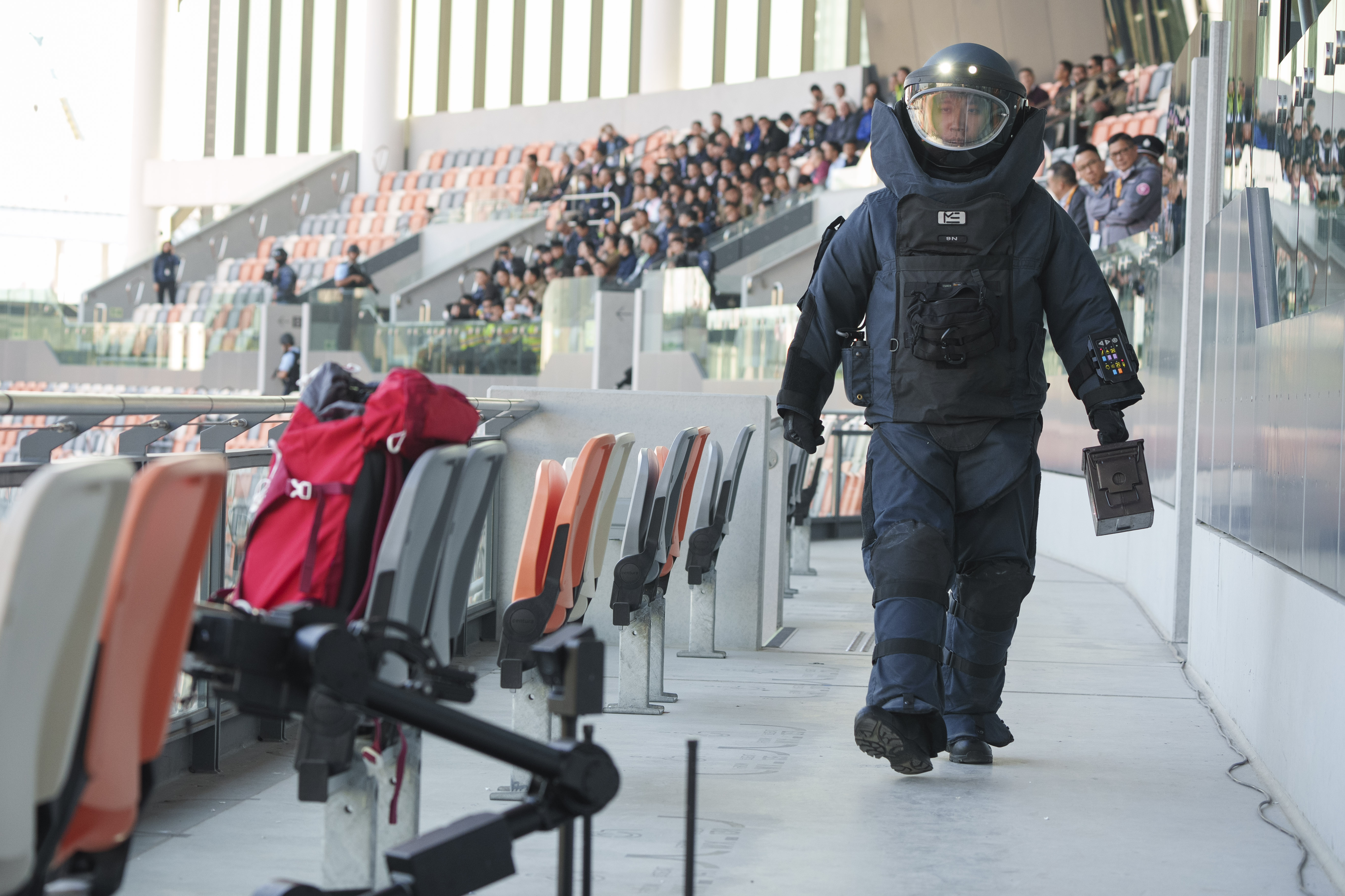 跨部門反恐專責組今日(12月17日)於啟德體育園內的青年運動場,舉行代號為「慧光」的大型跨部門反恐演習。