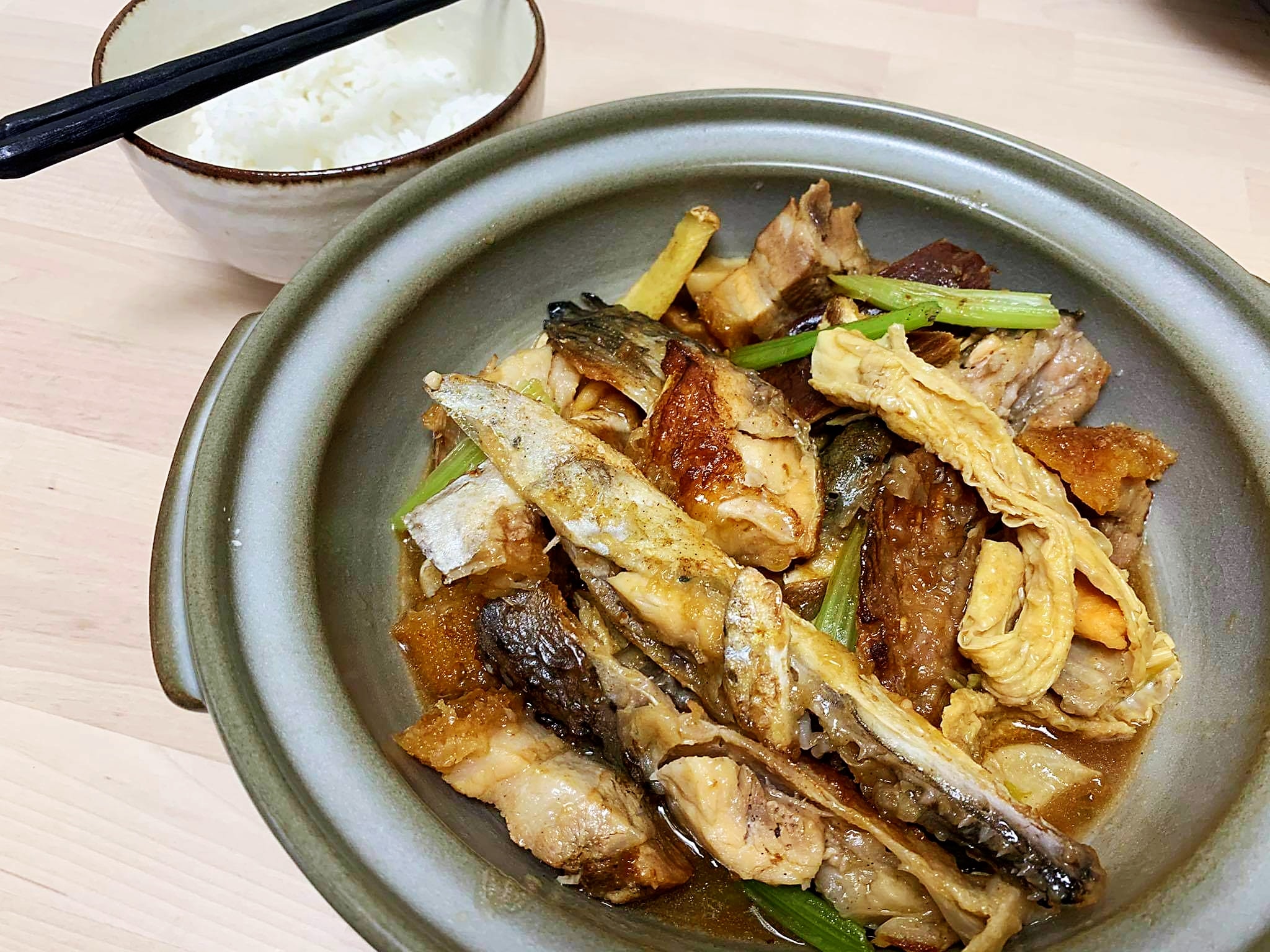 材料:三文魚頭、炸枝竹、燒肉、薑片、乾蔥頭、蒜粒、蔥段、唐芹