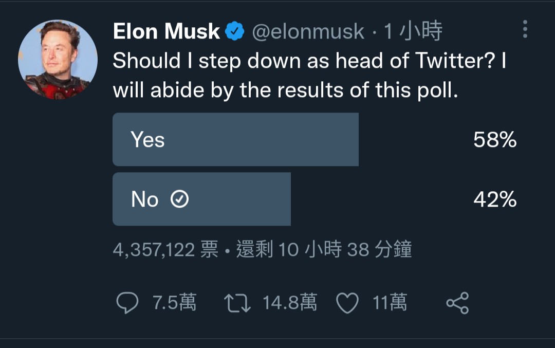 Twitter老闆馬斯克又發起民意調查,詢問用戶他是否該辭去Twitter負責人一職。