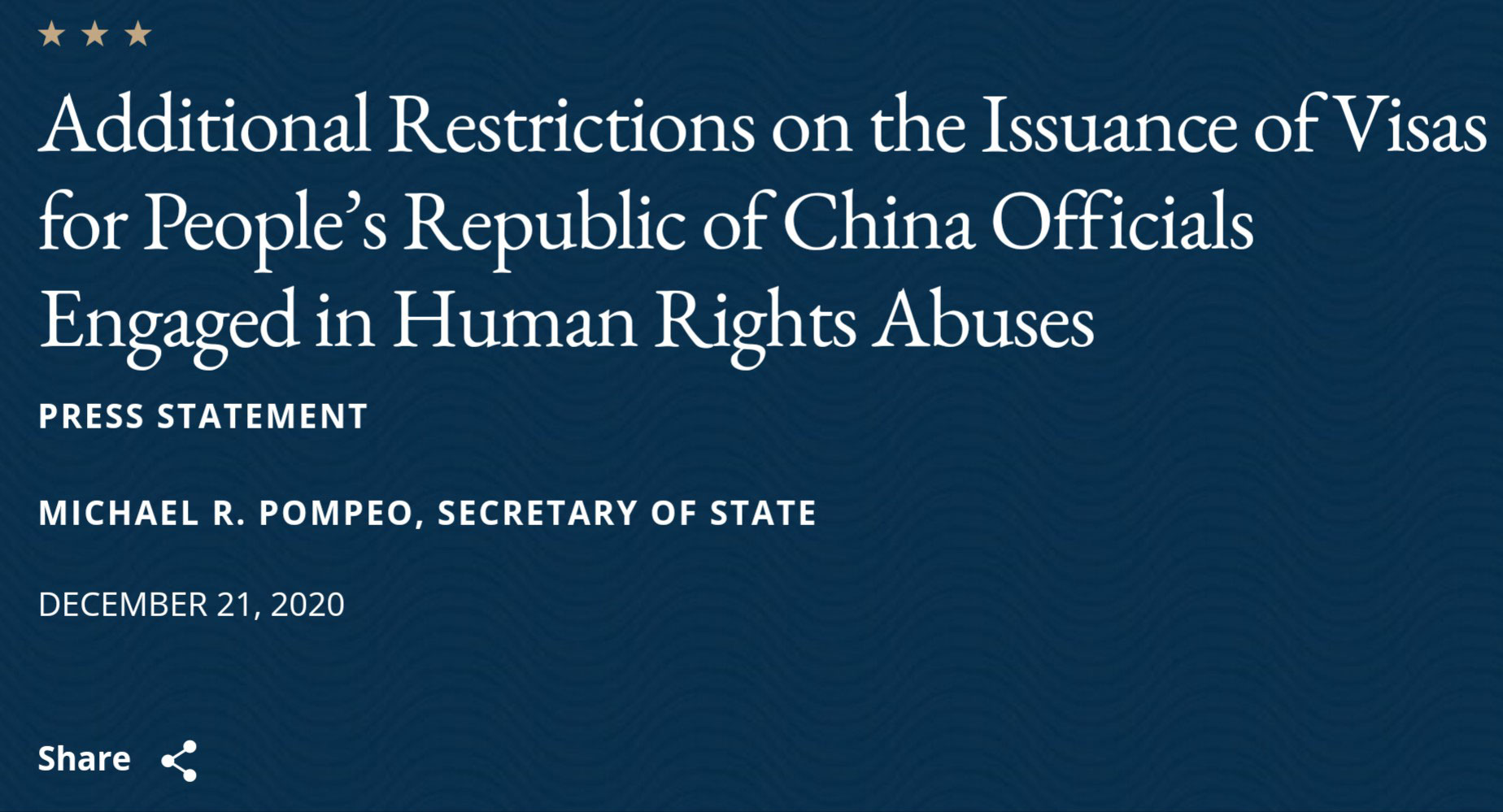 蓬佩奧表示,美國將禁止涉嫌打壓宗教人士、少數族裔、異見人士、維權人士、記者、工會組織、公民社團組織及和平示威者的中國官員入境。