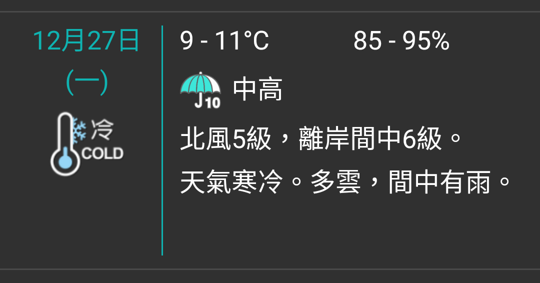 天文台表示,聖誕日風勢增強,拆禮物日(12月26日)及下星期一(12月27日)天氣顯著轉冷,多雲有雨,氣溫下降至10度或以下,下星期二早上仍然寒冷。