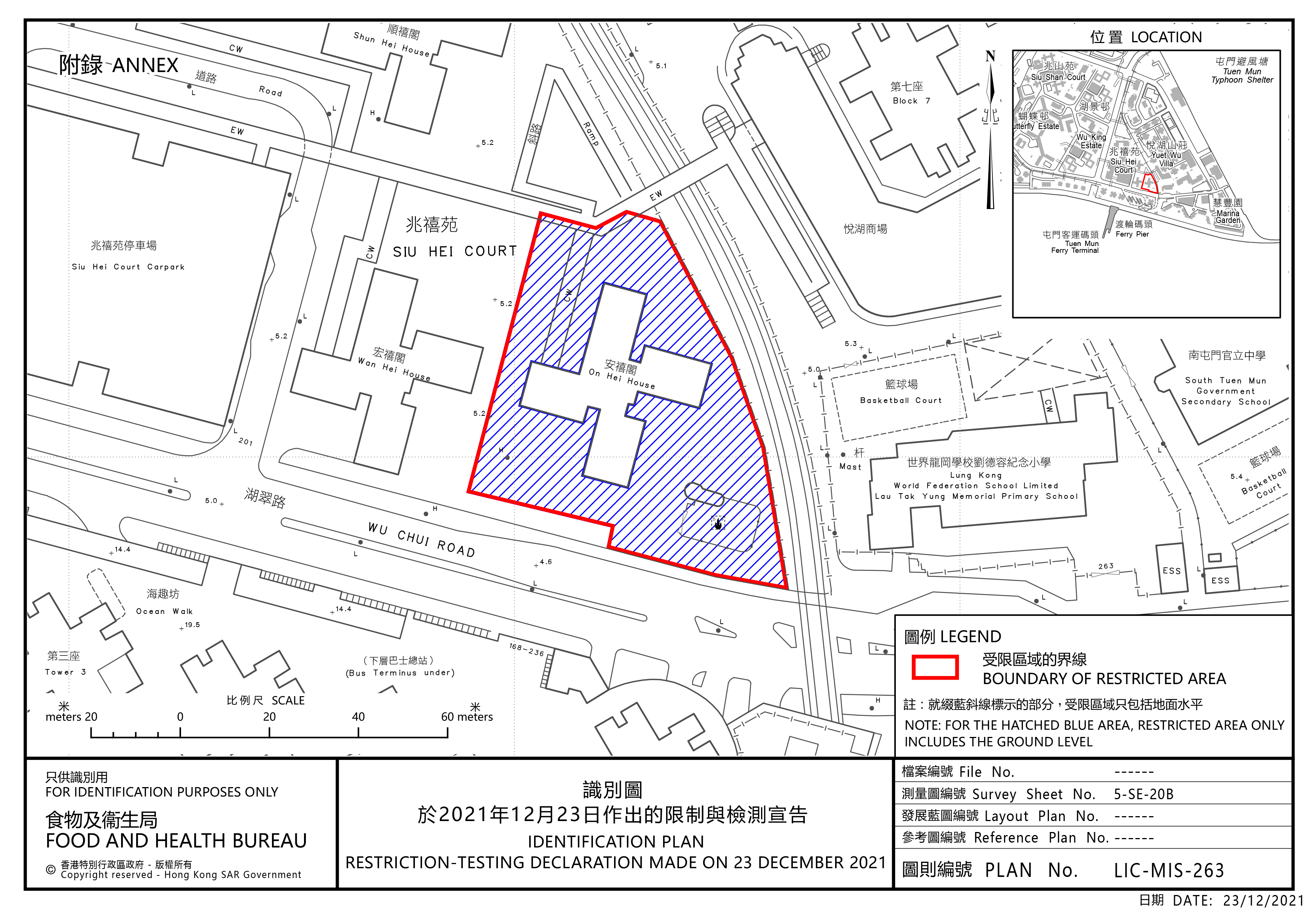 政府今日(12月23日)引用《預防及控制疾病(對若干人士強制檢測)規例》(第599J章),作出限制與檢測宣告,自晚上7時30分起限制在屯門指明「受限區域」,即屯門湖翠路201號兆禧苑安禧閣 (A座)內的人士,須留在其處所並接受強制檢測。受檢人士須在其處所等候,直至「受限區域」內所有已識別的受檢人士完成檢測,而相關檢測結果亦已獲大致確定,方可離開其處所。政府目標是在明日(12月24日)上午約7時完成此行動。