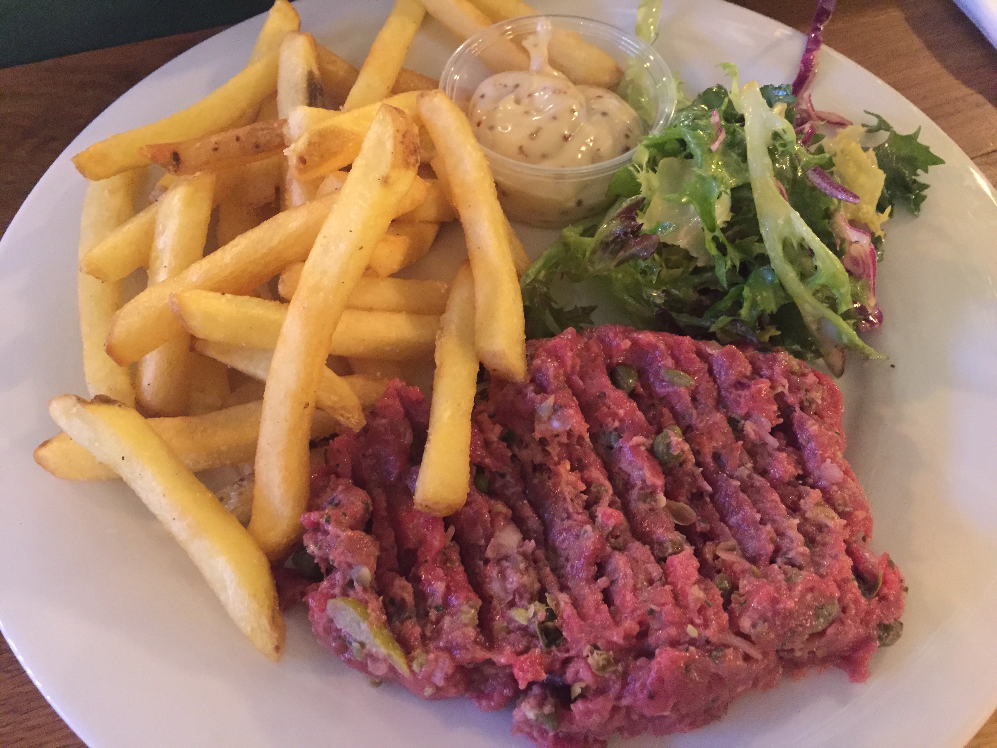玩了一輪機動遊戲有點肚餓,先在The Demon的小食亭吃了一個辣丹麥熱狗,然後再到美食廣場吃晚餐。美食廣場的餐廳應有盡有,我們選了一家吃青口和牛扒的,全都只賣DKK99,甚至比外面的餐廳便宜,我點了牛肉他他配薯條,非常好吃。