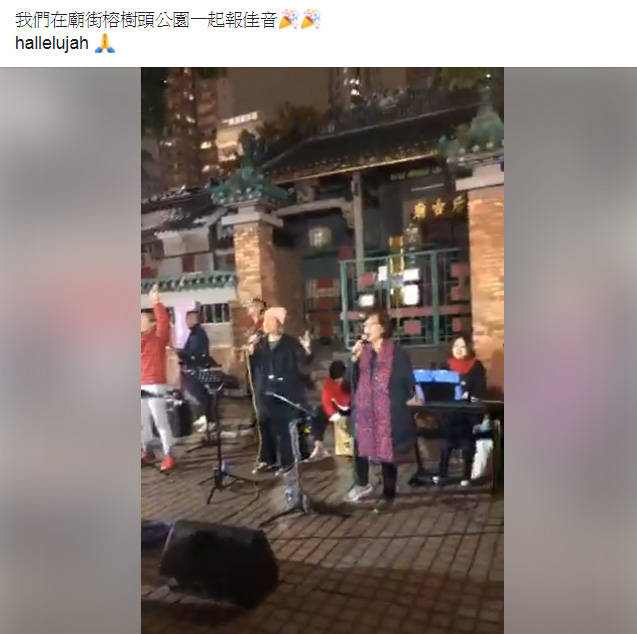 今日晚上,有身處榕樹頭的市民開 Facebook Live,再一次見到報佳音的大台與去年一樣,仍然選擇設在古廟門口,現場除了有樂器及音響之外,亦有數十人聚集一起唱聖詩。