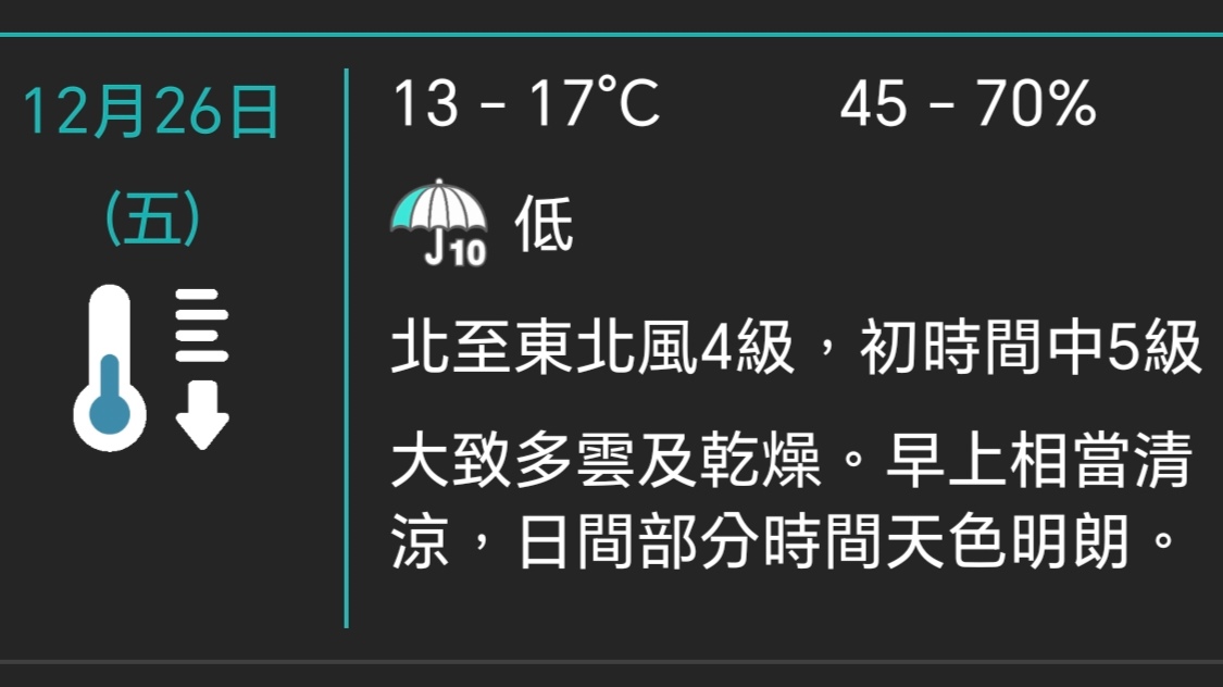 東北季候風正影響廣東沿岸,同時一道雲帶覆蓋該區。本港今早(12月26日)相當清涼,市區天文台總部錄得最低氣溫14度,新界...