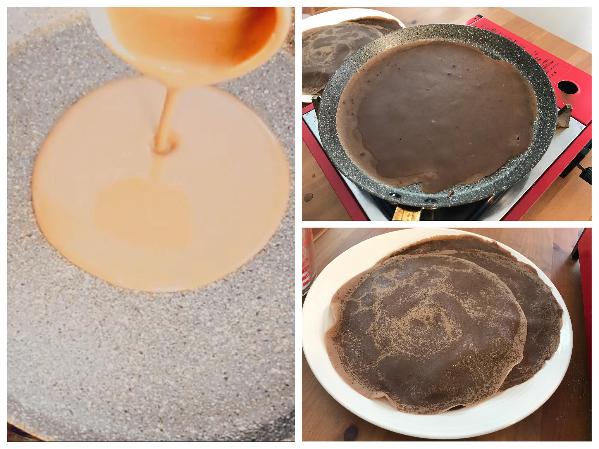 (2)落少許油在平底鑊,再用廚房紙抺走多餘的油份,加入1/3杯麵糊(麵糊每加一次都要拌勻),盡量做麵糊在平底鑊擴散開來,以中小火煎至表面開始乾爽(大約40秒至1分鐘)即可上碟(只煎一面即可),如是者重覆步驟直至煎完為上。煎好的可麗餅放涼備用。