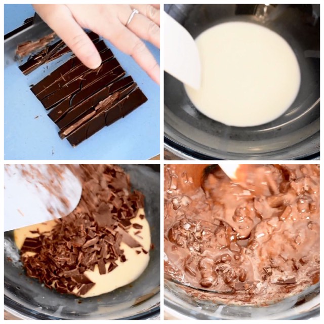 (3)預備Ganache:將鮮忌廉加熱(不要煮沸),朱古力切碎,將已切醉的朱古力倒入,靜置1分鐘,再慢慢拌勻至朱古力完成溶入和混合在忌廉中,即可室溫放涼備用。