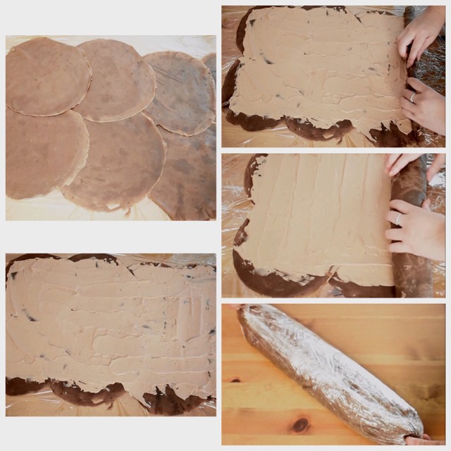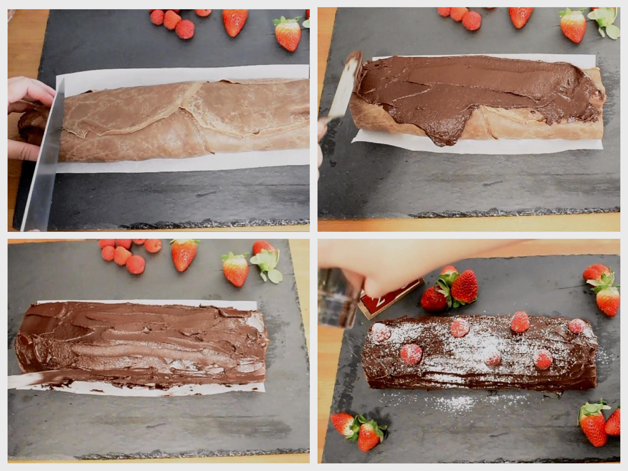(5)組裝:在枱上鋪上保鮮紙,將6-8塊可麗餅一塊一塊鋪排成長方形,在其上抺上朱古力忌廉,然後將可麗餅捲成長條狀,再將餘下6塊可麗餅一塊一塊鋪排成長方形,再抺上朱古力忌廉,將長條狀可麗餅放在上再捲一次成為粗條形,用保鮮紙包好放入雪櫃至少1小時成形。