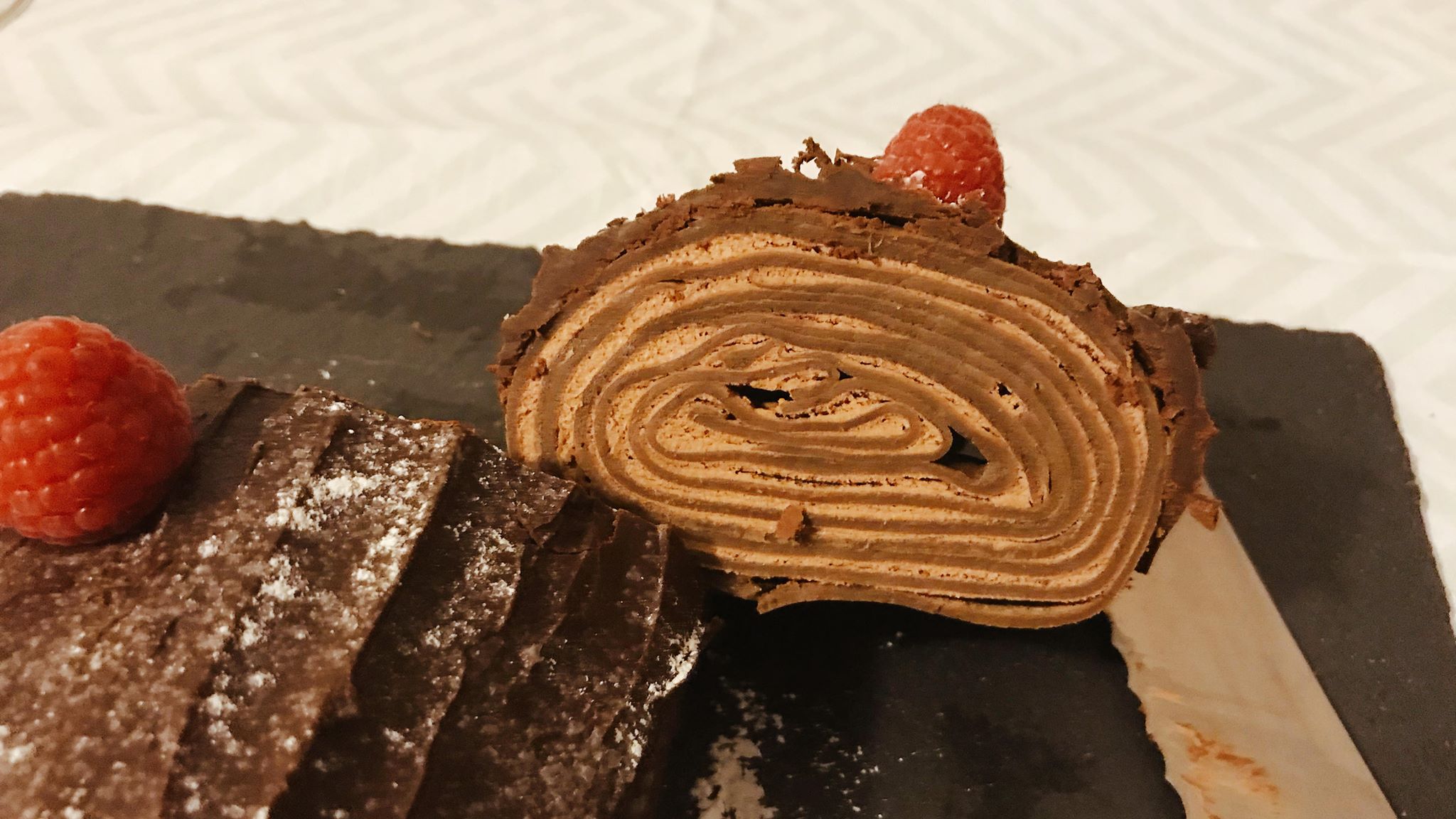 (6)裝飾:將雪好的可麗餅卷拆開保鮮紙,再將頭和尾切去,然後將Ganache塗抹在外面,用抺刀在其上抺出樹皮表面的模樣,再可以在上面加一些莓裝飾,最後灑上糖粉扮雪即可食用,或放入雪櫃3日內食用。