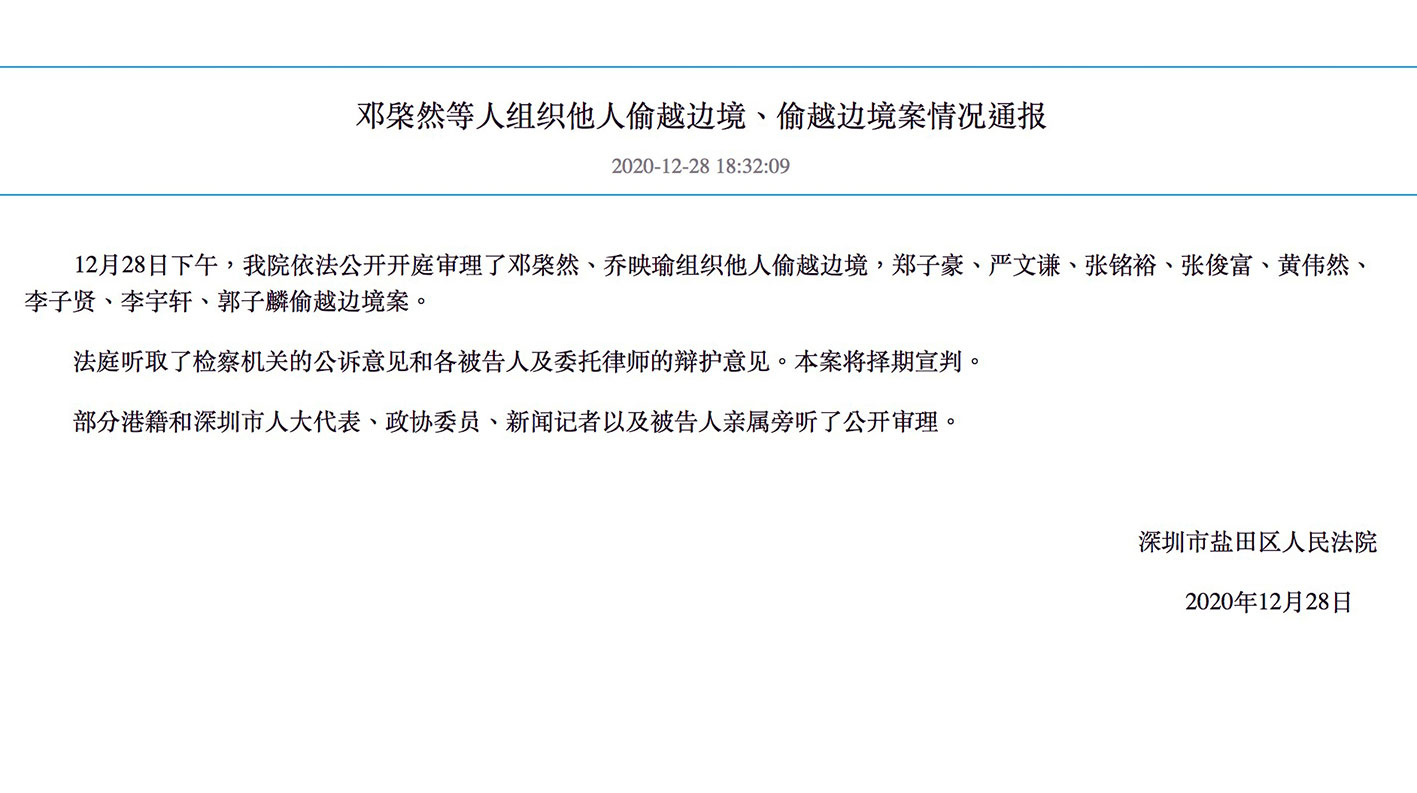 涉嫌偷越邊境案被廣東海警拘捕的12名港人,當中10人被深圳市鹽田區人民檢察院檢控,案件今日(12月28日)於鹽田區人民法院審訊。