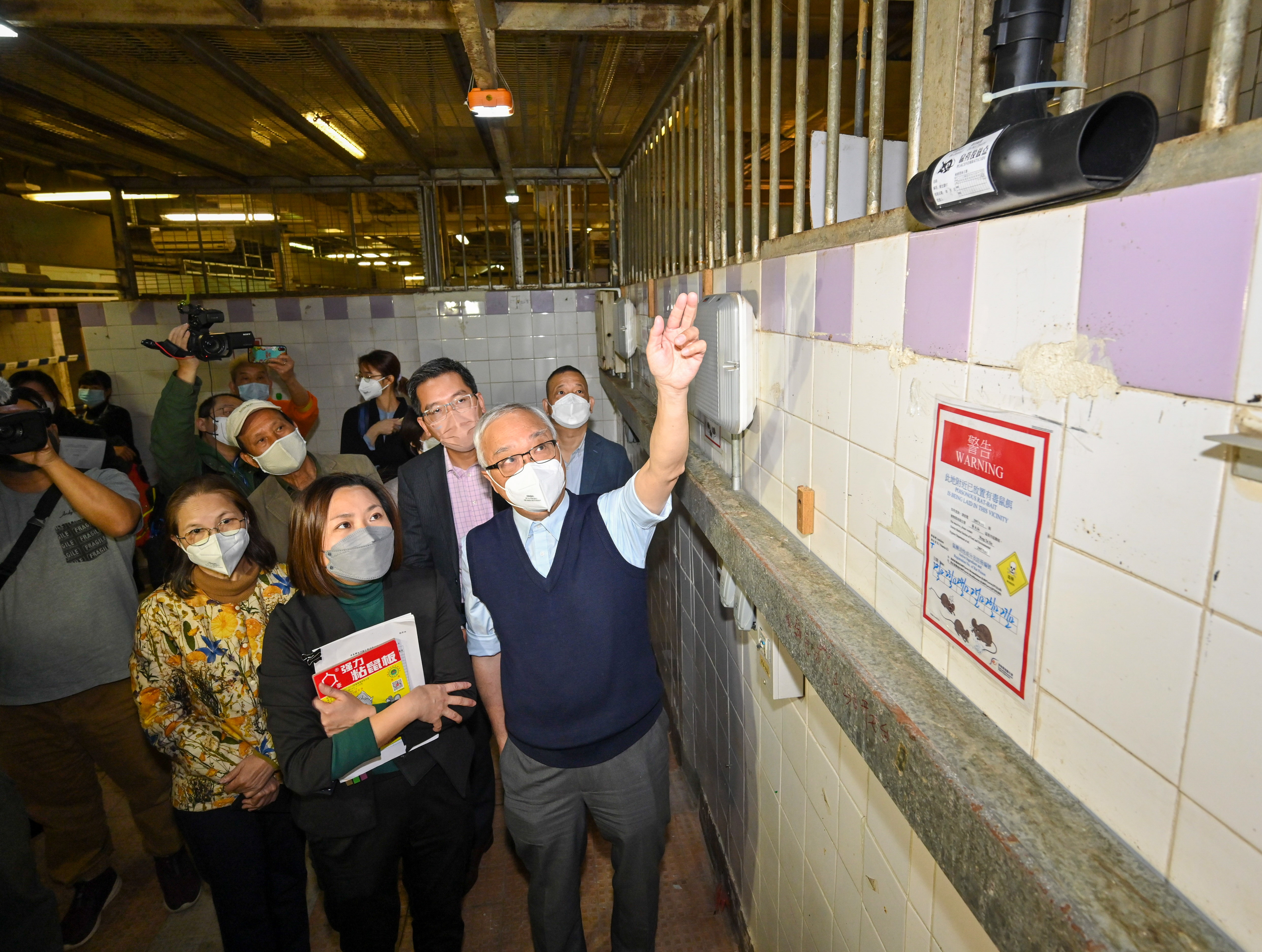 環境及生態局局長謝展寰、副局長黃淑嫻等人,今日(12月28日)到訪黃大仙區大成街街市,實地視察食環署人員和販商採取的強化防治鼠患措施,並正式啓動「各界滅鼠行動」。