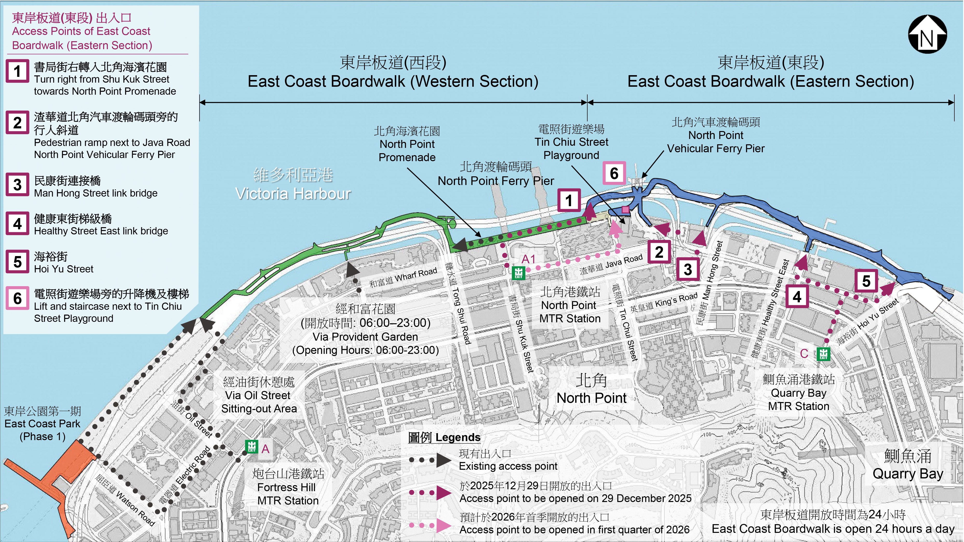 北角東岸板道(東段)明日(12月29日)上午6時起開放予公眾使用,開通這「最後一公里」,標誌由堅尼地城至筲箕灣全長約13公里的港島海濱正式貫通。