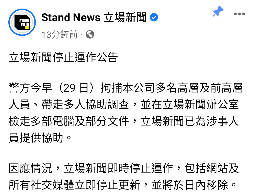 因應情況,《立場新聞》宣布即時停止運作,包括網站及所有社交媒體立即停止更新,並將於日內移除。署任總編輯林紹桐已請辭,所有員工已即時遣散。