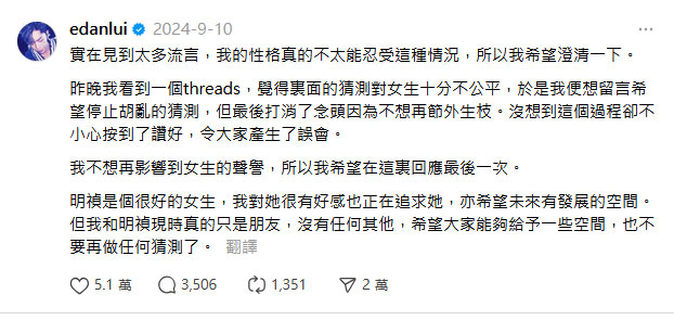 去到9月10日,活躍於threads的Edan,終於出文承認自己正追求林明禎,不過這篇threads帖文,最終慘成潮文,只要search「實在見到太多流言」,你會見到大量惡搞版本。