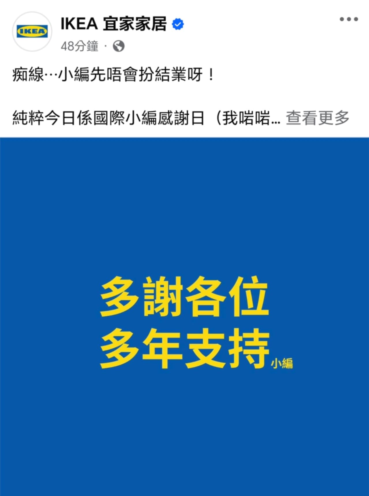 「多謝各位多年支持」就成為了當刻的模仿對象,不過最有參考價值留言,就是對手IKEA,抽水小編就話「小編先至唔會扮結業呀」。