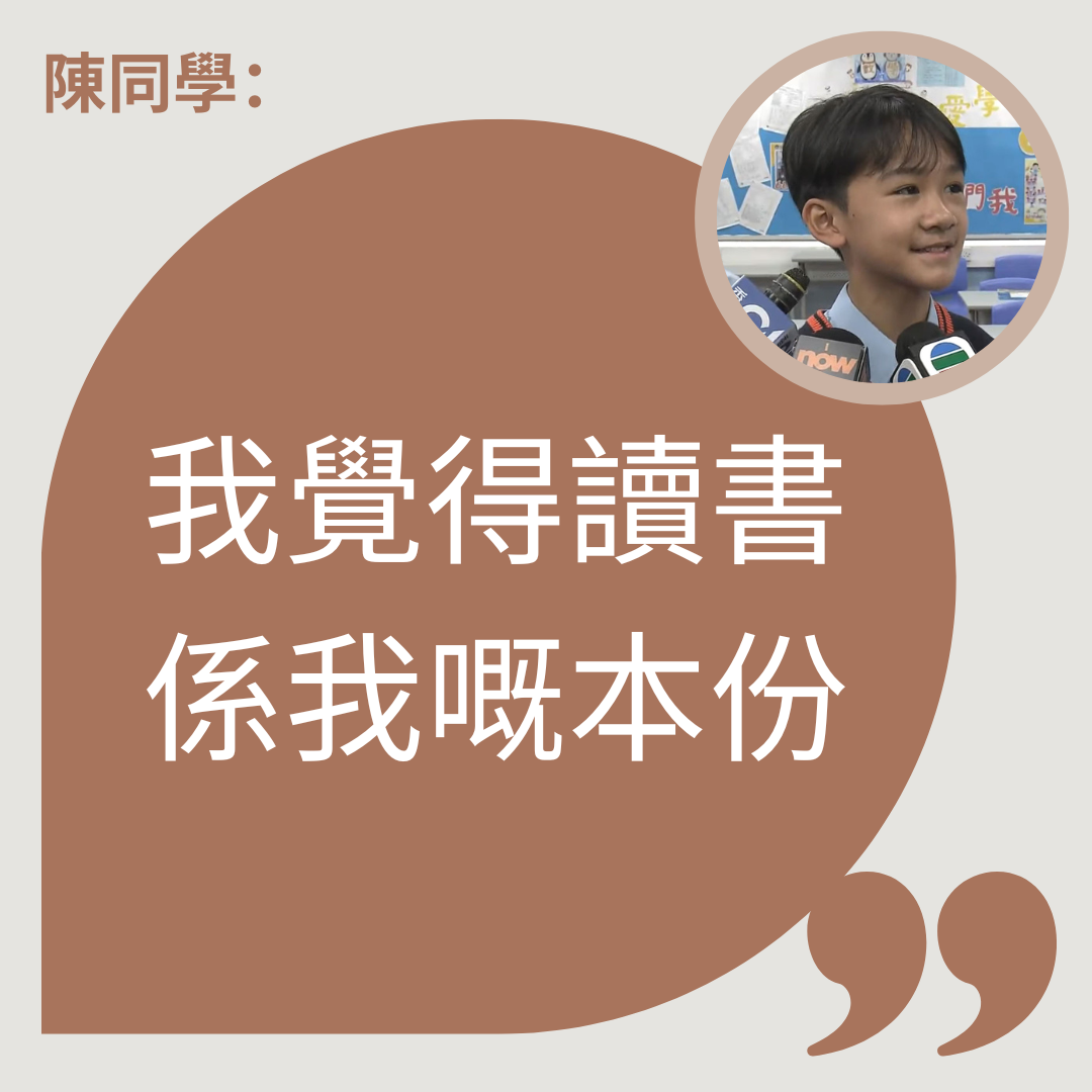 今年7月9日,now新聞報道中一派位結果,去到油麻地一間小學,訪問了一位準備升中的小六生陳同學,他說「辛苦就談不上,因為我覺得讀書係我嘅本份」。