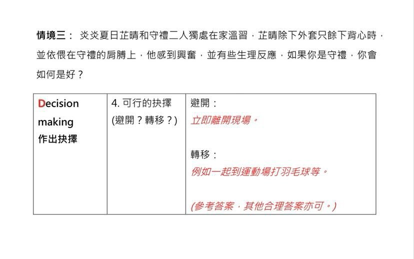 情境三: 炎炎夏日芷晴和守禮二人獨處在家溫習,芷晴除下外套只餘下背心時,並依偎在守禮的肩膊上,他感到興奮,並有些生理反應,如果你是守禮,你會如何是好?