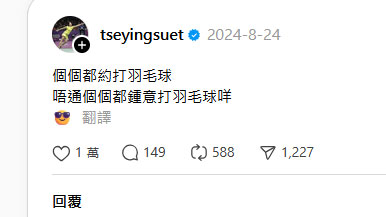 結果一齊打羽毛球由一個解決方法,演變成一個性暗示的代名詞,就連港隊混雙代表謝影雪都出了一個抽水post,話「個個都約打羽毛球,唔通個個都鍾意打羽毛球咩」。
