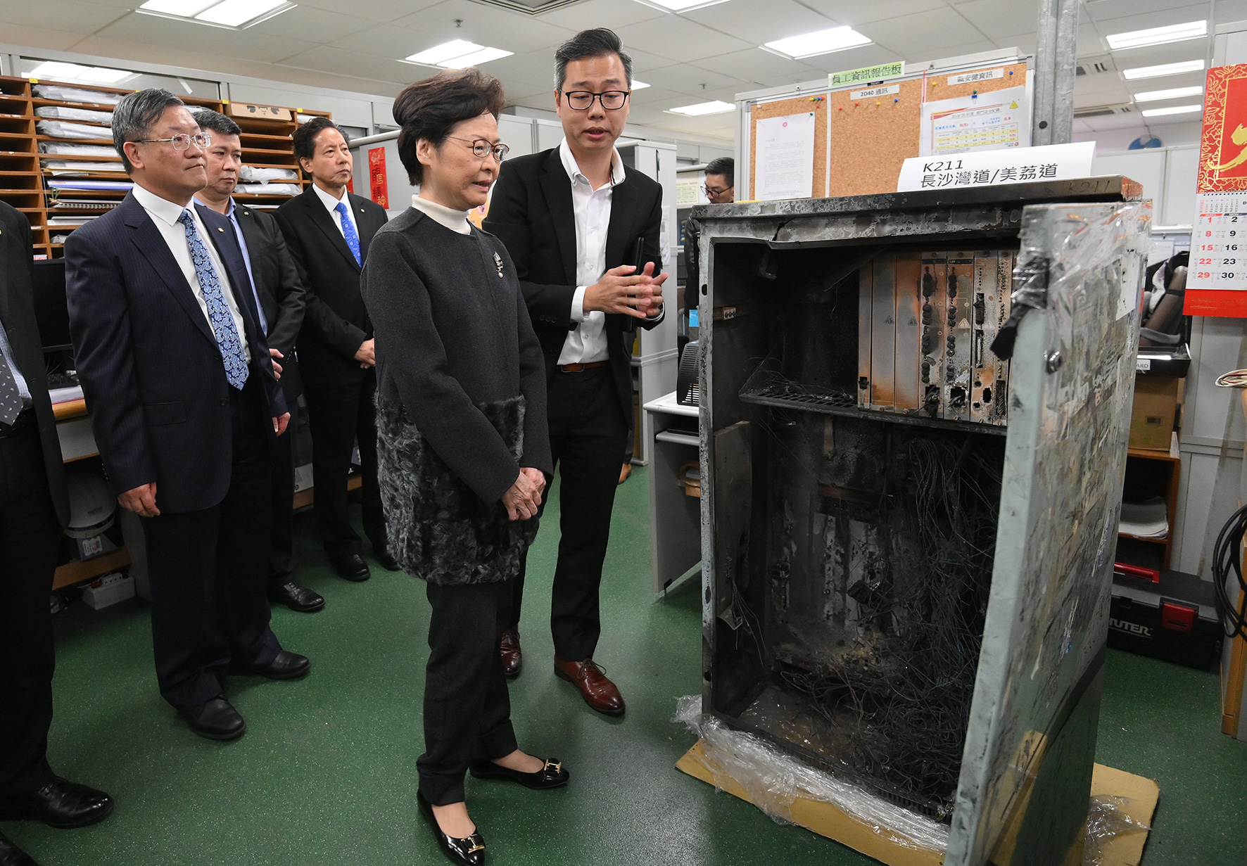 林鄭在署理機電工程署署長彭耀雄陪同下參觀交通燈工作坊和顧客服務部。自6月以來,全港約750組交通燈先後遭到破壞超過1400次,機電工程署從不同組別調派有相關經驗的同事加入搶修團隊,高峰時期的人手由約80人增至約160人,以期在早上繁忙時間開始前完成修復交通燈。截至今日,受損的交通燈已全部恢復運作。