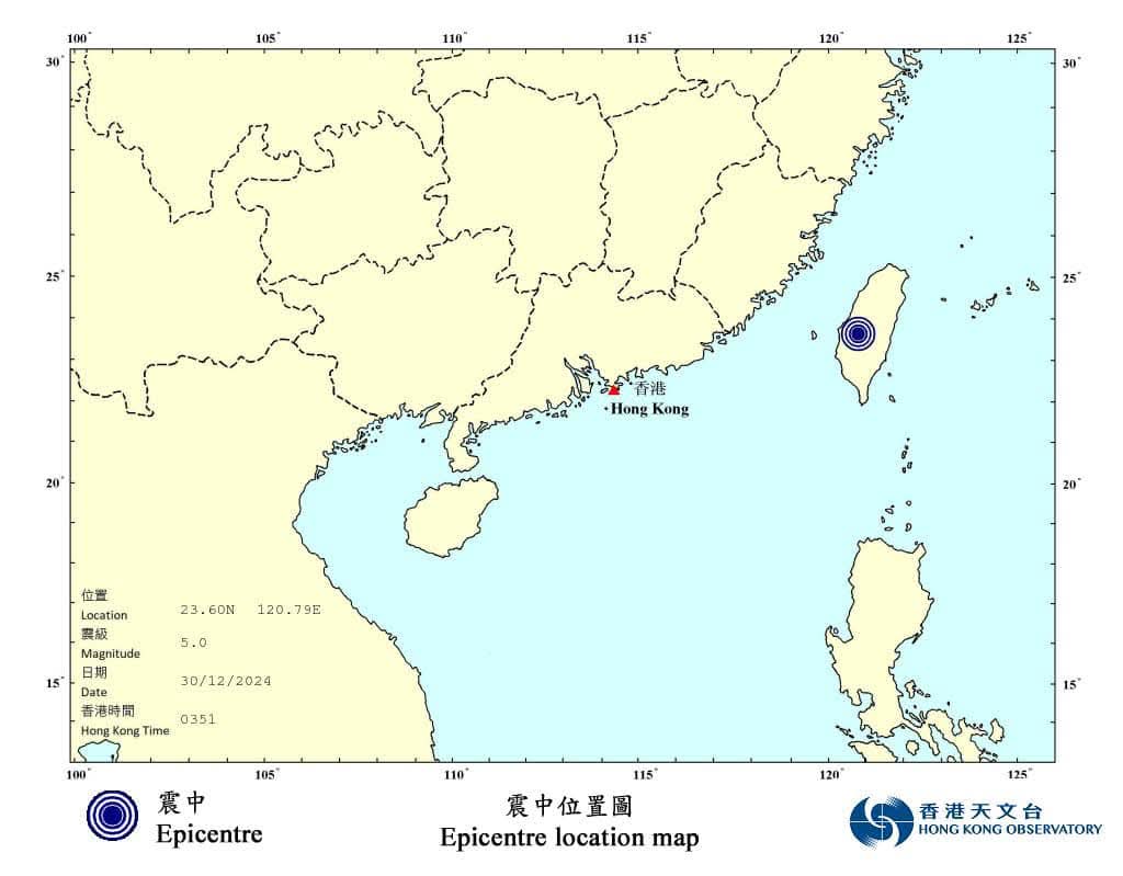 首頁港聞港聞 台灣嘉義5級地震 天文台接獲市民報告感輕微震動 作者:熱血編輯部 (陳五) 12-30-2024 Like Facebook Twitter 更多 Like 分享0 留言0 今晨(12月30日)3時51分台灣發生一次黎克特制5.0級地震,香港天文台接獲數名市民報告,表示感到輕微震動,震動維持數秒。震央位於北緯23.60度,東經120.79度附近,即嘉義之東北偏東約44公里,即距離香港之東北偏東約690公里,震源深度約5公里。初步分析顯示,本港的地震烈度為修訂麥加利地震烈度表的第II(二)度,即在樓宇上層或合適位置,且在靜止中的人有感。
